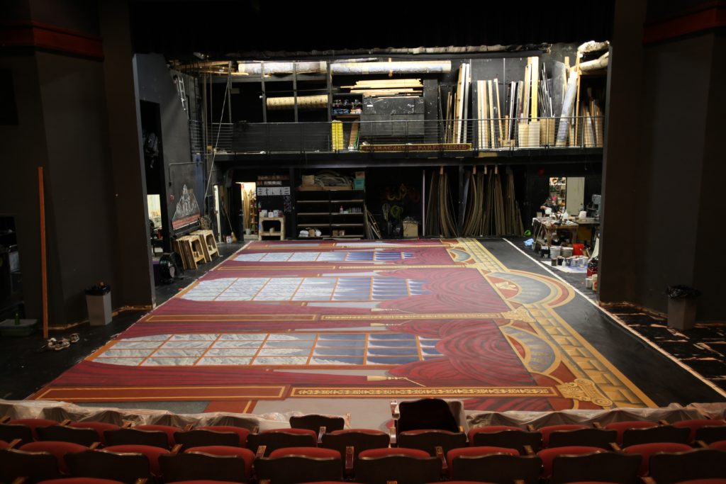 Northwest Dance Theatre commissioned a handful of incredibly skilled scenic artists to hand paint a backdrop in the traditional 19th century style, for their production of The Nutcracker. George Fox’s Woodmar acted as the paint shop for this project. Along with painting, Emma was the main source of documentation for the process. She took photos after each hour of work and wrote up a summary at the end of each day.